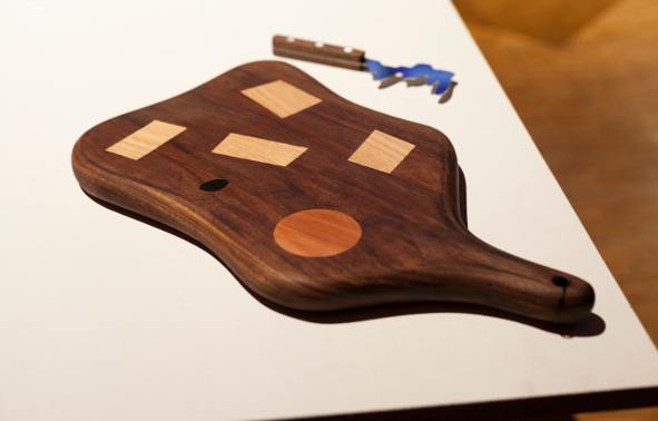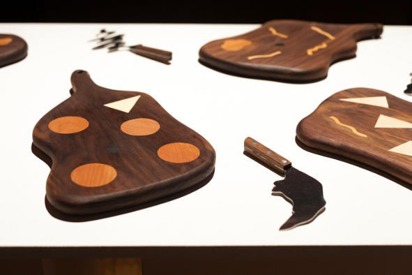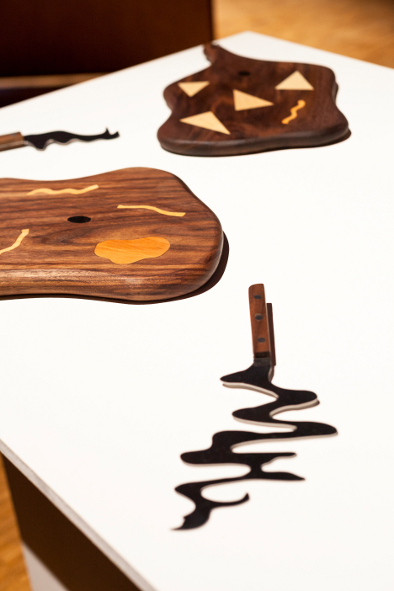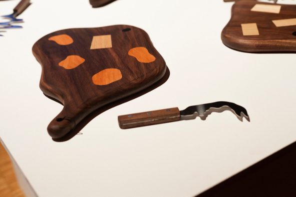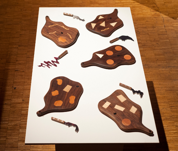 Planches en noyers, incrustations en érable, cormier, pommier, alisier, ébène.Couteaux en inox, poignées en noyer. Exposition 100%, Halles de la Vilette.