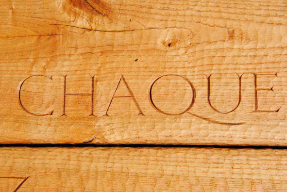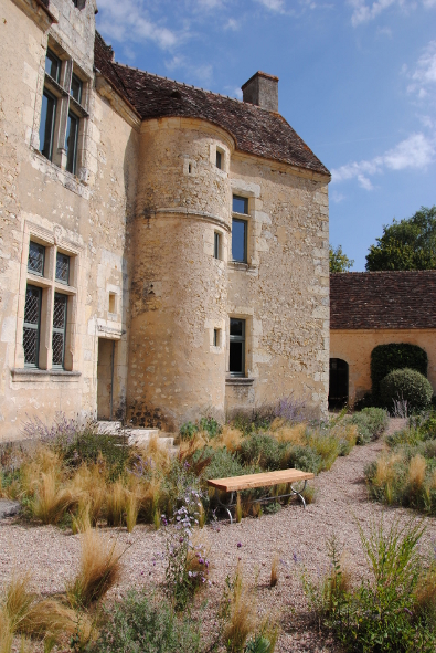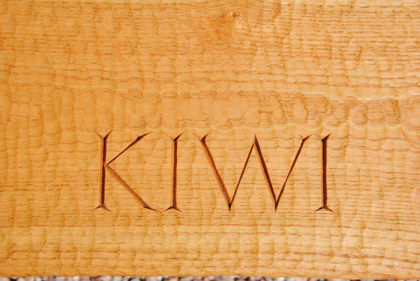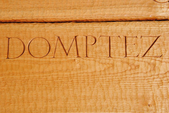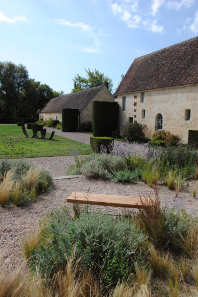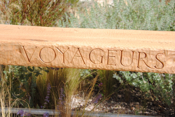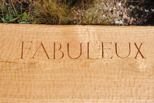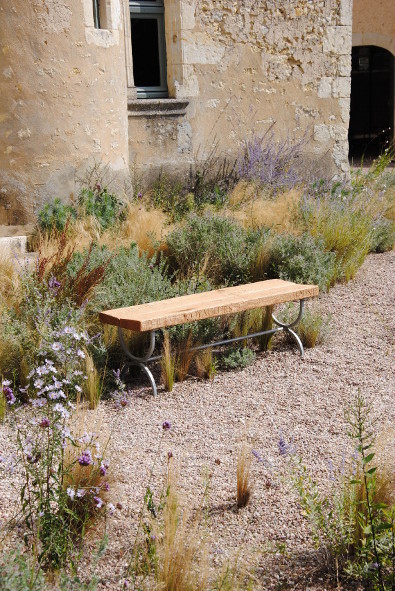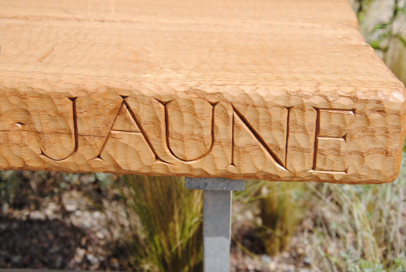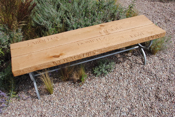 Banc en châtaignier texturé et gravé, assise en acier galavanisé. Manoir de Soisay, Normandie.
